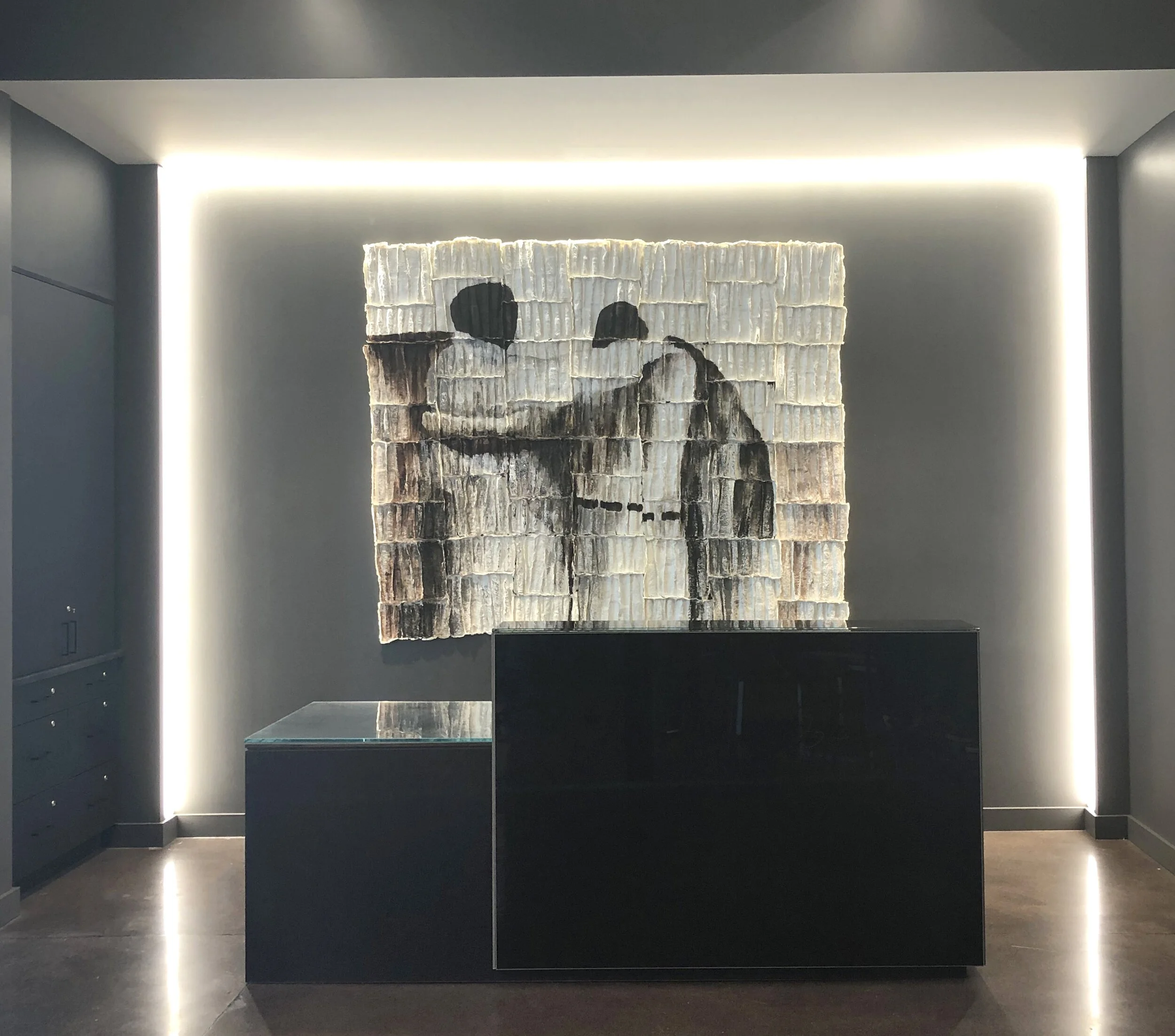 The branded environment was a vital part of the experiential design and went beyond just an emphasis on company identity. This was ultimately accomplished by incorporating colors and textures which set an intentional mood: transcending the corporate location in a suburban office park and creating a setting which nurtures an appreciation for their work in a global context.